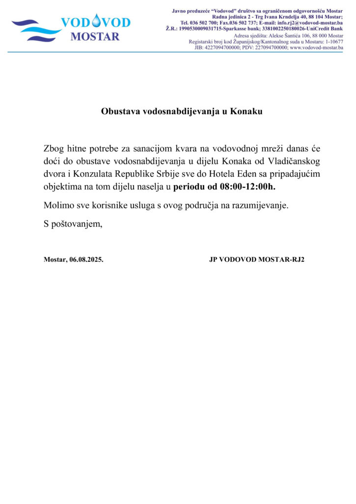 Obustava vodosnabdijevanja u naselju Zali do 15:00 h