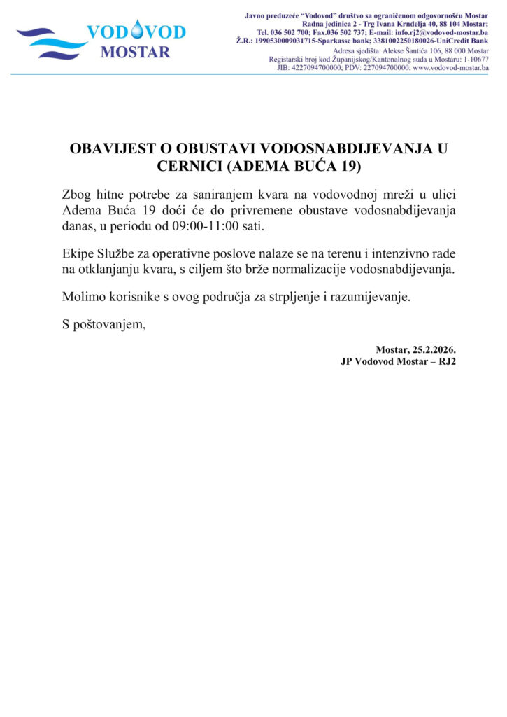Početna » Obavijesti » OBUSTAVA VODOSNABDIJEVANJA U ULICI ADEMA BUĆA 19